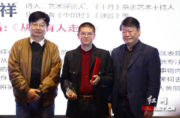 会上,黄明祥、晴朗李寒、陆辉艳分别以作品《从未有人走过》《月光下的磨刀人》《心中的灰熊》获得“第一届中国青年诗人奖”,其中黄明祥诗集《中田村》曾获中国作协诗刊社、鲁迅文学院等单位颁发的中国桃花潭国际诗歌艺术节“2015年中国优秀诗集奖”。中国作协诗歌创作委员会副主任叶延滨、评论家唐晓渡给黄明祥颁奖,授奖词中讲到:“其《从未有人走过》简约,淡远,而又深情,内敛,作者专注地使用着自己独特的语言谱系,他的专注里有着窥伺者的犀利和精准,并坚持指向事物内部的秘密。”