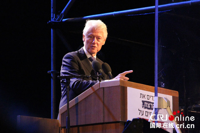 美国前总统克林顿在拉宾遇刺20周年纪念集会上演讲。(摄影:张瑾)