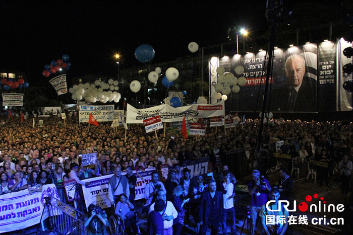大约10万人聚集在以色列特拉维夫的拉宾广场上,纪念拉宾遇刺20周年。(摄影:张瑾)