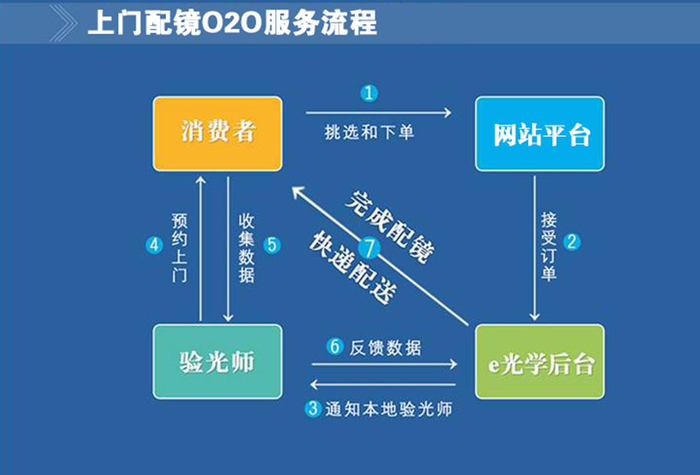 e光学摒弃传统门店验光配镜方式,砍掉门店高房租、高费用让利于消费者,物美价廉的同时让消费者足不出户在家里、在办公室里就可以轻松享受到高品质的专业验光配镜服务。客户只需要通过e光学购买平台下单购买眼镜架和镜片,后台便会收到客户的订单,然后由e光学联系当地的验光师,验光师接到订单后联系客户约定上门验光时间。工作人员采集完客户的验光数据,会在4-5个工作日配好客户所需的眼镜,并在第一时间用快递的方式送达,完成由下单验光和配送的完整生态闭环。
