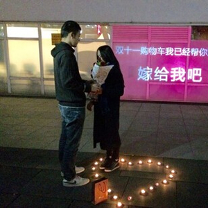 这件事就发生在昨晚,地点是北京CBD某商务办公楼楼下。记者接到热心市民电话赶到现场时,就看到了照片上的这一幕。女子站在用蜡烛围成的心形圈里,男子单膝跪地,手里举着一束鲜花,在女子背后有个投影,上面写着:双十一购物车我已经帮你清空了,嫁给我吧!只是记者当时不明白,为何在心形圈旁还放了一个类似保温杯的东西。