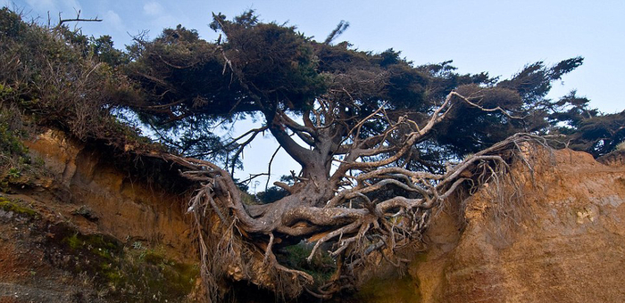 悬崖随着时间推移受到侵蚀,而巨树则在继续茁壮成长。(网页截图)