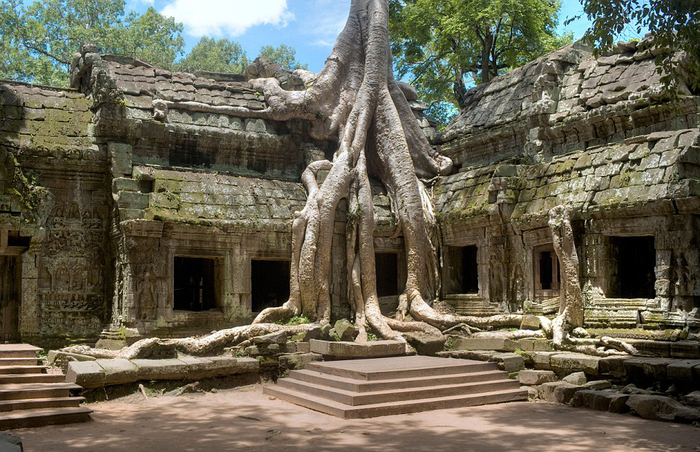柬埔寨塔普伦寺的丝棉树非常奇特,其巨大树根几乎将寺庙缠绕起来。(网页截图)