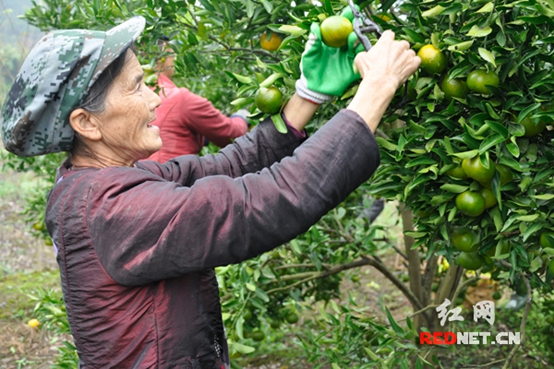 60多岁的张望玉在椪柑种植大户李圣友的基地里采摘椪柑,每天收入70元