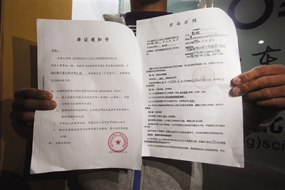 11月2日,“我爱洗车”员工拿着劳动合同和欠薪举证通知书。
