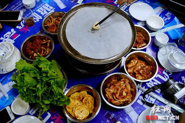 烤架烧热,几块牛油打底,等待发出滋滋滋的响声就可放上事先腌制好的各类荤菜。先把相对不容易熟的猪脚和鸡翅等放在盘子边上,中间铺上容易熟的猪五花、牛肉、牛排这些。烤盘上的肉吸收了炭火的热气,散发出来的香味也显得格外醇厚浓郁。劲道的带皮猪脚、鲜嫩的牛肉和包裹在生菜里面的烤五花是店里最受欢迎的荤菜。