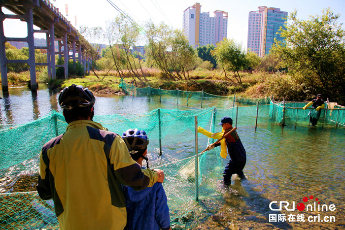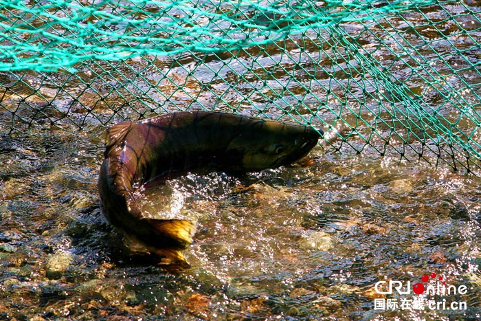 太和江内如今繁衍着大马哈鱼、香鱼、鲮鱼、水獭等。图为工作人员捕捉大马哈鱼后查验雌雄,以便做科学统计 摄影:陈鹏