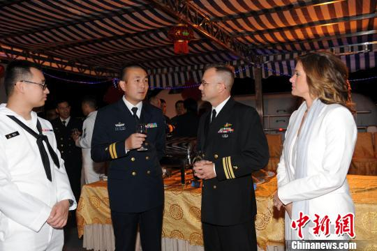甲板招待会上,中美海军官兵相互交流。 江山 摄