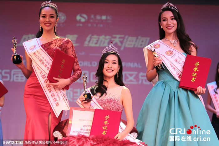 2015年11月12日,上海,第65届世界小姐中国区总决赛在天海邮轮上决出前三甲。 袁璐(中),何丽(右)和曹青青(左)分获冠、亚和季军。图片来源:纵一/视觉中国