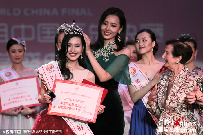 2015年11月12日,上海,第65届世界小姐中国区总决赛在天海邮轮上决出前三甲。 来自安徽的袁璐成为了最新一届中国小姐。为她戴上桂冠的是上届的冠军杜旸,“世界礼仪皇后”MISS DALLY在一旁见证。图片来源:纵一/视觉中国