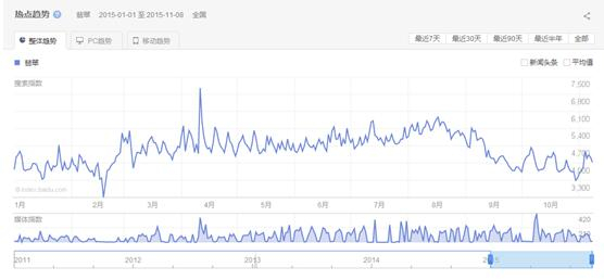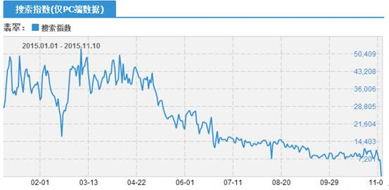 而从淘宝指数提供的数据来看,2015全年,翡翠相关宝贝的单日搜索次数的峰值在50000以上,即便到了秋冬淡季,翡翠的单日搜索次数也能稳定在15000的水平。