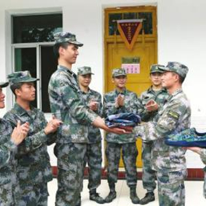 11月12日,成都军区13集团军某团新兵连的操场上,郑鋆衡获得“训练之星”的荣誉胸牌。新兵连指导员站在他前面,高举双手为他佩戴胸牌。