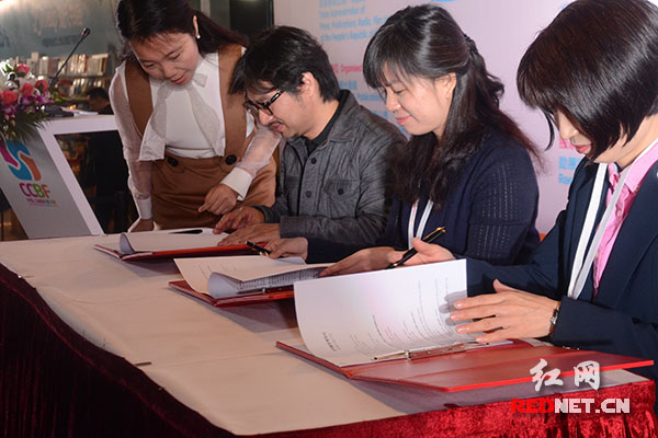 红网上海11月14日讯(通讯员 邓超 时刻新闻记者 秦芳)14日上午,在2015年上海国际童书展展区,湖南少年儿童出版社就《大英儿童漫画百科》一书与韩国未来恩出版集团举行版权签约仪式。
