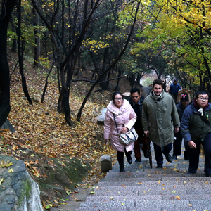慕田峪长城素以险峻闻名。初冬的雨后,山间层林尽染,分外妖娆。而要看到更美的风光,还要攀爬1000多级台阶,才能登上长城,将周边一览无余。即使有的网友已不是第一次见长城,但还是怀着满格的新鲜感,奋力向上向前。当城砖踩在脚下时,网友们不由地兴奋,再加上导游的讲解,他们对长城已是赞叹不已。