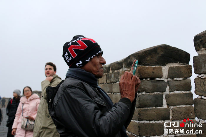 印度网友在长城上拿出手机拍照。摄影 付承堃