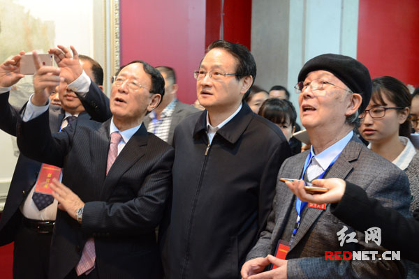 湖南省委常委、长沙市委书记易炼红(中),胡耀邦同志长子、中共中央统战部原副部长、中华全国工商联合会原党组书记胡德平(左一),艺术家周小愚(右一)等欣赏纪念胡耀邦同志诞辰100周年油画艺术展。
