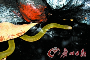 今年10月中旬,自然爱好者朱毅武应朋友之约来到广州白云山风景区,一行人带着相机、电筒等设备,目的是夜观水生小动物。当朱毅武来到白云山西麓的一条溪流附近时,却看见一条小青蛇一见到电筒光就快速躲藏于水底或枯叶下。