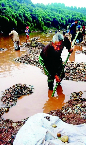 一个多月前,贾连平开始到洗猪滩捡挖河石,断断续续,挖了100多斤回家。贾连平说,起初自己只是因为觉得好看,想去捡来收藏,转机发生在12日,一位来自重庆的收石人来到镇上,找她买了20多斤石头。“他们从11点挑到下午3点左右,100多斤就挑了20多斤,按照200元每斤的价格,卖了4000多元。”