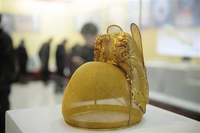 在定陵出土文物展厅内展出的明朝万历皇帝皇冠,游客可以一睹定陵出土文物真容。
