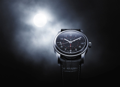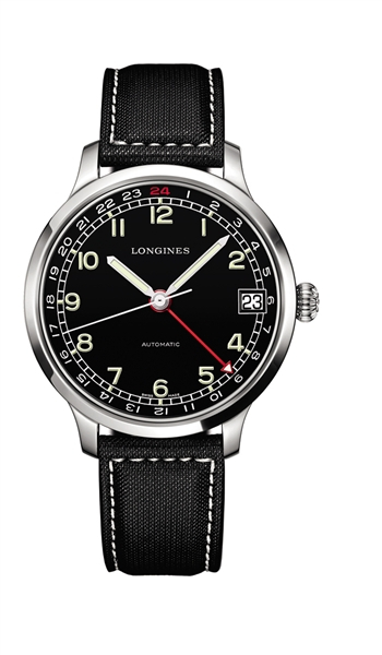 这款表传承了浪琴表1930年代生产的军用表设计。经典的洋葱头表冠极具时代感,硕大白色阿拉伯数字以及分钟刻度盘与黑色表面形成鲜明对比,黑色表带上缝有白色丝线,勾勒出冷峻之美。这款腕表还有一根红色指针搭配24小时数字圈来准确指示第二时区的时间与昼夜情况。