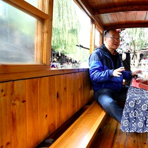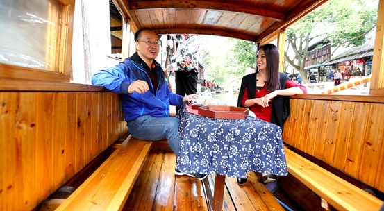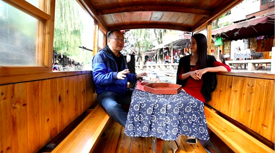 丹丹和吴志祥乘坐周庄乌篷船在小桥流水间畅谈
