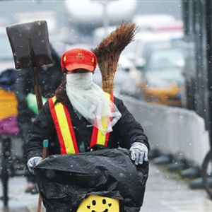 昨日北京迎来第二场雪,方庄街头,一位环卫工人雪中骑车。新京报记者 尹亚飞 摄
