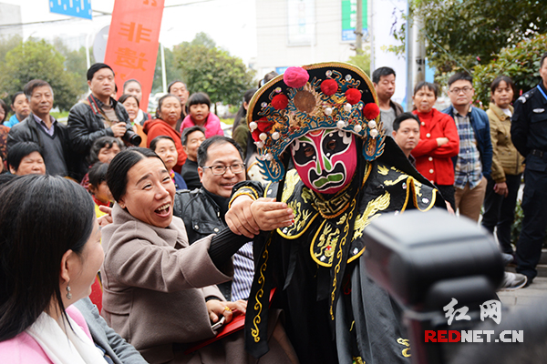 湖南省文化厅、长沙市文广新局相关领导为非遗传承人现场颁发荣誉证书。红网长沙11月22日讯(时刻新闻记者 彭双林 实习生 周楚怡 通讯员 邓运姣 梁湘茂)现场核雕、杂技表演、川剧变脸……11月22日下午,长沙雨花区红星木雕城内,2015中国·雨花非遗文化节举行非遗专场演出暨颁奖典礼,数十个精彩节目齐刷刷亮相舞台,市民尽享非遗展演盛宴。其中,川剧变脸演员走进观众席中,让市民触摸脸部,近身感受变脸之神奇,让市民大呼过瘾。