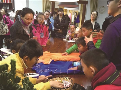 同一座科创园内,由85后设计师黄秋停创办的新旗艺丝绸,则对服饰有些截然不同的诠释。设计唯美、用料讲究的各式旗袍,再加上传递着中国传统文化的盘扣,牢牢锁住了小记者的眼球。大家将设计师围住,问题一个接着一个。陪同前来的妈妈们,驻足于一件件旗袍前,交流着对优雅的理解。