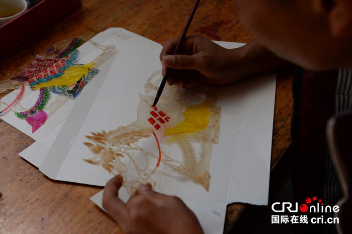 刘永周弟子进行皮影的敷彩着色。供图:谭青。
