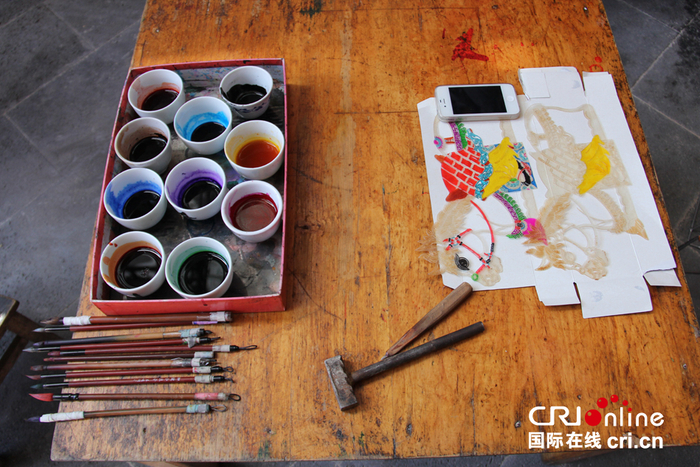 先将牛皮的毛、血去净,然后经药物处理,使皮革变薄,呈半透明,涂上桐油,然后艺人们将各种人物的图谱描绘在上面,用各种型号的刀具刻凿后,再涂抹上颜色,上色时主要使用红、黄、青、绿、黑等五种纯色。摄影:张斯路