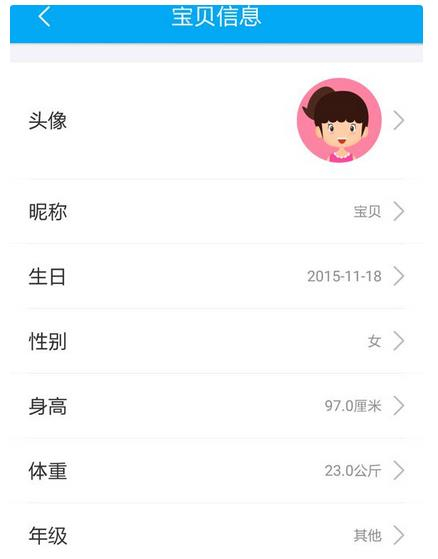 下载安装后,需要对宝贝的个人信息进行设置,如身高、体重、学级等,然后APP通过网络,自动会和手机进行一次同步。