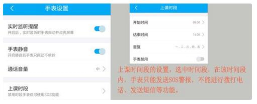 点击管理-手表设置,就可以通过手机,设置手表声音、通话音量、实时监听提醒和上课时间段的设置。