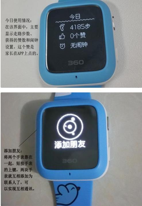3.短按手表的下键主要是进行4种屏幕的界面切换,其中包括手表的待机界面、时间的另一种时钟表示、以及今日使用情况和添加朋友界面。