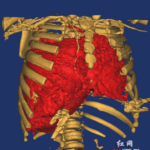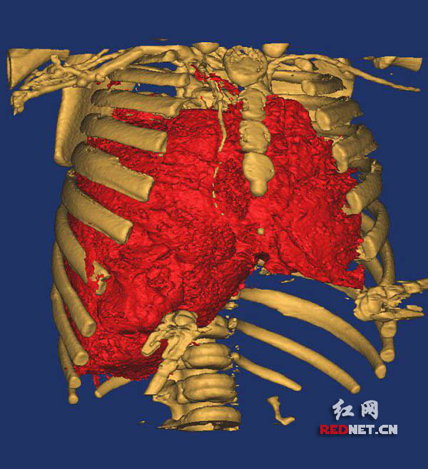 为了进一步明确肿块累及区域,设计最佳手术路线,主治医师张志功为茂茂进行了肿块、胸廓骨骼及心脏三维关系重建。11月17日,医生在全麻下为茂茂施行剖胸探查和右侧胸腔肿块切除手术。经过3个多小时的紧张操作,成功切除一个20×15cm大小、重达600g的肿瘤,病检结果证实为良性的“脂肪母细胞瘤”。通过查询全球最大的医疗数据库“美国国立卫生研究院数据库”显示,像茂茂这样的胸腔脂肪母细胞瘤全球有报道的仅10例。