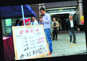 银行门口竖立着存款利率的宣传牌吸引村民。
