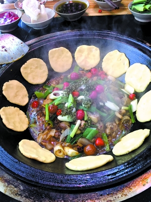 最后,在大铁锅里倒入少许汤汁,焖六七分钟就可以大快朵颐了。一揭开锅盖,带着刺鼻麻辣香的土鸡香味,就会随着蒸汽翻滚而出,让人食指大动。