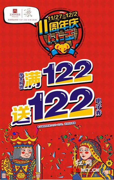 王府井11周年周末买满122送122电子券。