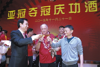 11月21日,恒大淘宝夺得亚冠冠军后,许家印(左)、马云(右)、斯科拉里(中)庆祝。图/CFP