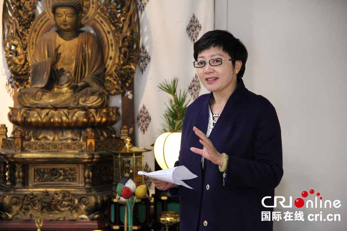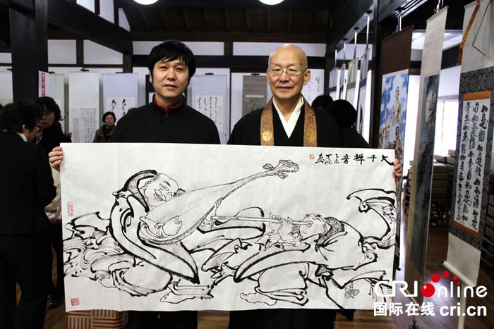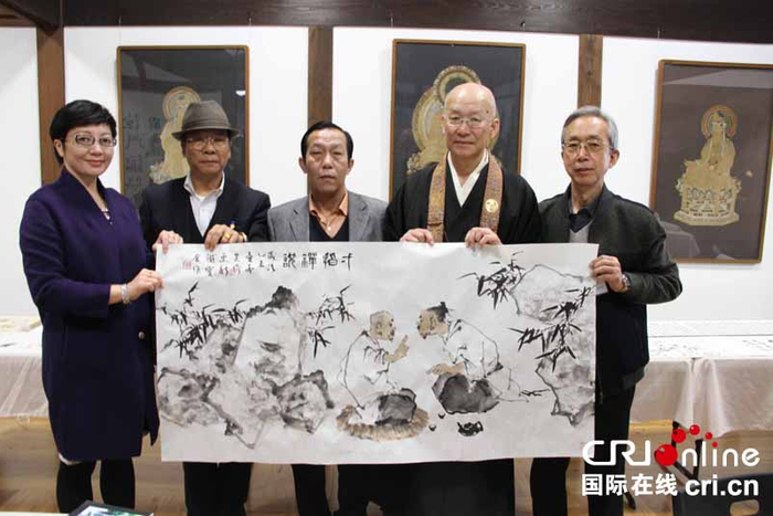 国际在线消息(记者 李阳):11月27日,由中国国际广播电台策划主办的大型跨国文化交流活动“和而不同·东北亚书画汇”在日本大阪总持寺开幕。本次书画展是继9月8日北京中华世纪坛和11月12日湖北黄冈博物馆举办同名展览之后,首次来到日本进行巡展。现场共展出来自中国、日本、韩国、蒙古国的精品力作20余幅。中国国际广播电台东北亚中亚地区广播中心负责人张晖,大阪总持寺方丈中西隆英,日本文化放送理事白籏正彦,中国著名书法家、篆刻家刘铁宝,画家吴齐,唐天源,日本书画家小林芙蓉等七位中日两国书画艺术家以及百余位书画艺术爱好者参加了开幕式。