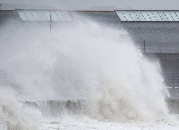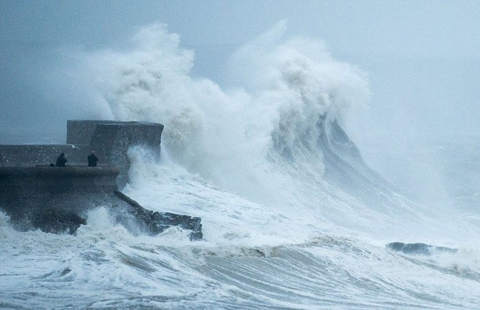 来自大西洋的风暴接近英国,巨浪冲入南威尔士波斯考尔(Porthcawl)港口护墙。(网页截图)