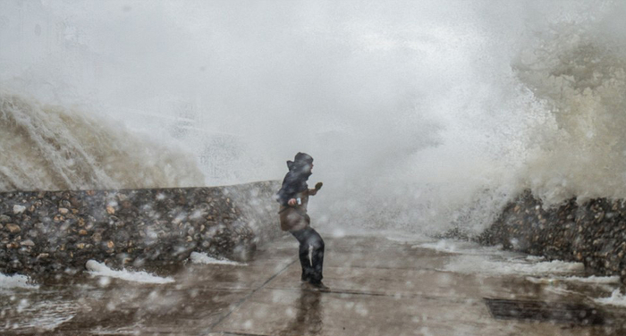 图中是巨浪冲入波斯考尔港口的场景。(网页截图)