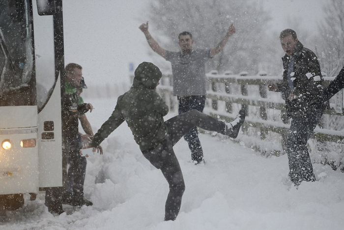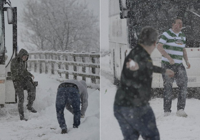 本来前往因弗内斯观看比赛的球迷,中途打起了雪仗。(网页截图)