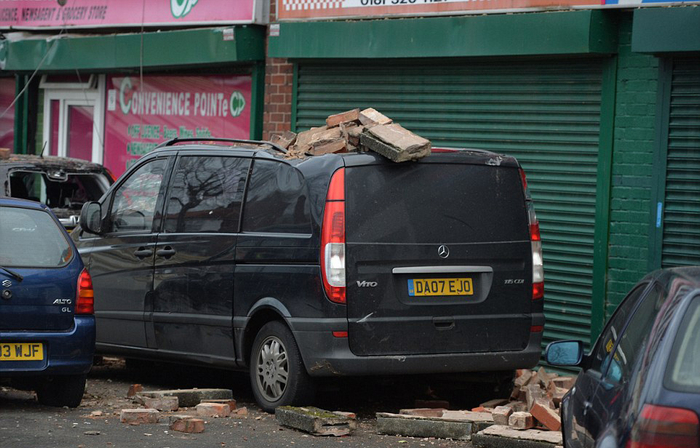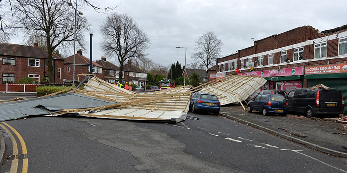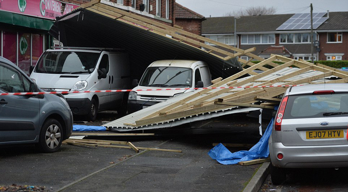 曼彻斯特多家店铺屋顶被狂风掀飞,街道一片狼藉。(网页截图)