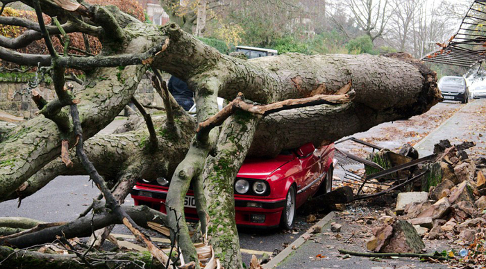 一辆汽车被狂风吹倒的大树砸坏。(网页截图)