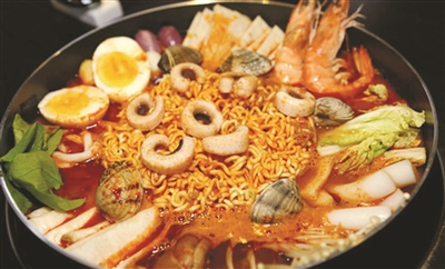 喜欢吃韩国菜的人肯定都吃过一种名叫“部队”的火锅。这种火锅跟中国火锅不同,一上来,菜品全部码好了在其中,有一大块方便面,火腿肠、通心粉、午餐肉、豆腐、泡菜、葱、蘑菇、粉条、年糕、肉丸儿、茼蒿,中心位置当然少不了红红的一堆辣椒酱,食材都整整齐齐的,跟排队一样。