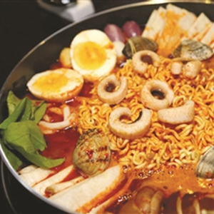 做法:1、准备好所有材料。2、锅里热油爆香大蒜片。3、放入火腿条、大虾、泡菜继续煸炒。4、倒入高汤或清水。5、放入年糕煮至沸腾,放到酒精炉上。6、放入豆芽,放入油菜。7、放入口蘑片。8、中间放入一块韩国方便面,放入韩国辣酱。9、放入芝士,放入香葱直接上桌,边煮边吃啦。