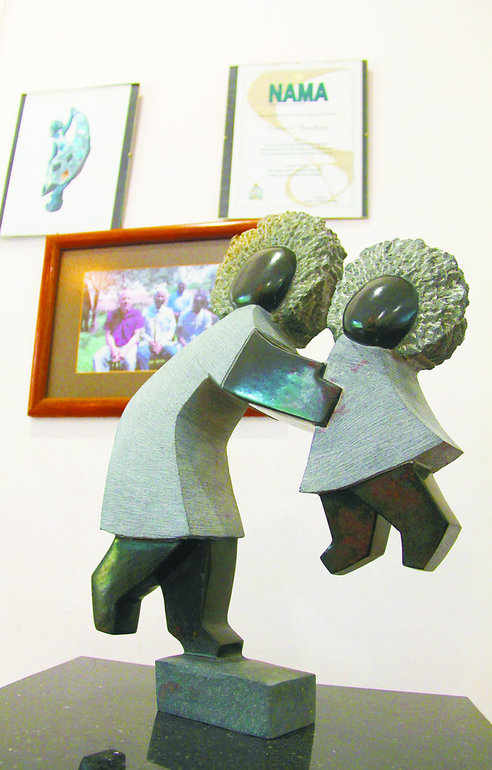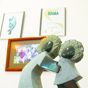 在多米尼克众多作品中,“妈妈摇摇我”系列作品成为最具名声的石雕。该作品曾赠予南非前总统曼德拉,现仍保存在曼德拉基金会约翰内斯堡总部。另外,多米尼克的很多作品亦被津总统府收藏,或被总统穆加贝赠予外国贵宾。谈起这些,多米尼克显得尤为骄傲。他的很多作品还被英国、美国、比利时等国的博物馆收藏,他指着挂在墙上的证书和奖状逐一向记者介绍道。