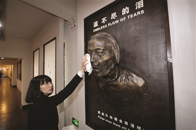 记者注意到,在陈列馆二楼,有一处名为“流不尽的泪”的陈列,一名半身浮雕的年迈“慰安妇”眼眶里,泪水汩汩而下,浮雕下方写着一行字——“请您为她擦去眼泪吧!”金陵科技学院大一学生刘雨阁看到这里时泪如雨下,她说:“这里的每一个展品,每一幅图片,都是一章“慰安妇”的血泪史,更是侵华日军的罪恶史。‘慰安妇’的每一滴泪,都是在向全世界展示和控诉罪行!”