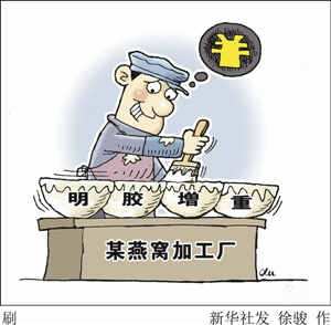 一位做燕窝批发的网友说,自己从厂家拿的九成干燕窝小条,一公斤4000元,而有些人报价才1650元。“但这价格加工厂都做不来,怎么办?刷明胶增重呗,有时候能加20%,反正也吃不死人。”