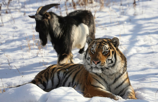 在俄罗斯西伯利亚的滨海边疆区野生动物园,一只原本买来当活猎物的山羊不但没入虎口,还成了老虎的朋友。